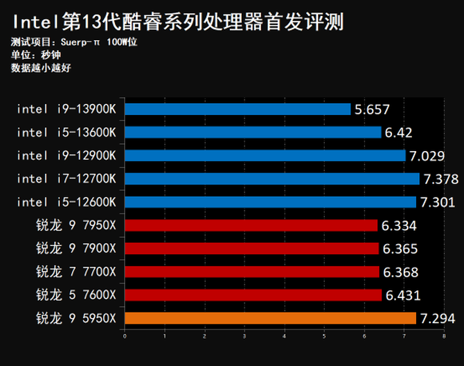 Super-π是我们常用的测试处理器单核性能的软件,在这个测试项目中我们选择计算π小数点后100万位测试处理器的单线程性能表现,所用时间越短越好,单位为秒钟,最终我们得到上图,最终我们可以看到,在默认频率下,Intel酷睿i9-13900K的单核性能非常恐怖,远超上代i9-12900K,并且全面大幅度领先目前全新的锐龙7000系列处理器和上代5950X,单核性能表现优秀!