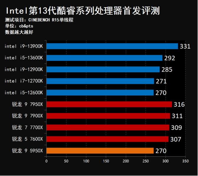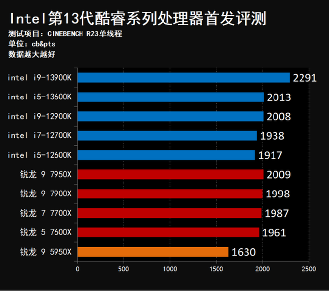 R23测试项目中,13代酷睿的两款处理器的性能表现依然出色,Intel酷睿i9-13900K的单核心成绩来到了2291,完全处于全面领跑的状态,领先上代i9-12900K约14.1%,同样领先锐龙 9 7950X约14.1%,并且i5-13600K的成绩同样略微领先上代旗舰12900K处理器,也超过了锐龙 9 7950X以及AMD全部7000系列处理器的性能。这样的成绩表现对于AMD锐龙7000系列处理器来讲着实是个不小的打击。