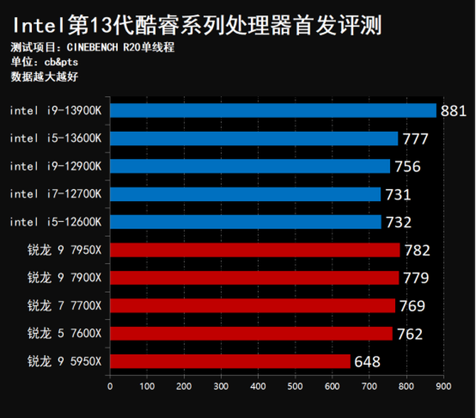 而i5-13600K的多核心成绩则全面领先上代i7-12700K,R15相对i5-12600K领先37.9%,R20则为28.3%,R23则为24.1%,对于AMD锐龙7000系列处理器,多核成绩超锐龙 7 7700X。