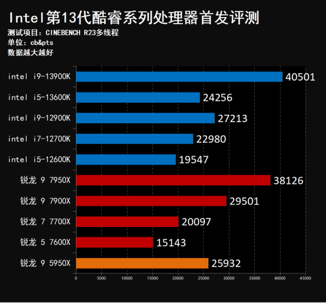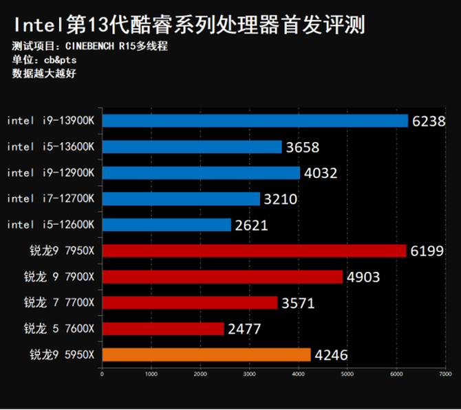 多核性能方面,全新的第13代Intel酷睿i9-13900K依旧领跑全场,性能表现非常出色,在R15测试项目中,i9-13900K领先上代i9-12900K约54.7%,R20则为53.7%,R23则为48.8%;对比AMD锐龙 9 7950X,i9-13900K的多核心成绩同样全面领先。