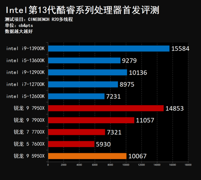 在R20测试项目中i9-13900K领先上代12900K约16.5%,领先锐龙7950X约12.6%,同样i5-13600K的成绩表现同样非常霸道,领先上代i9-12900K,并且和锐龙 9 7950X和7900X的性能非常接近,难道这一代的i5又是默秒全?直接战翻AMD锐龙刚推出的7000系列处理器?我们接着往下看。