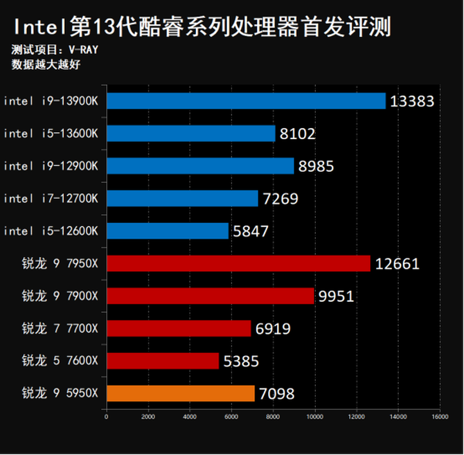 I5-13600K则领先上代i5-12600K约38.5%,领先锐龙 7700X约18.5%,性能表现出色。