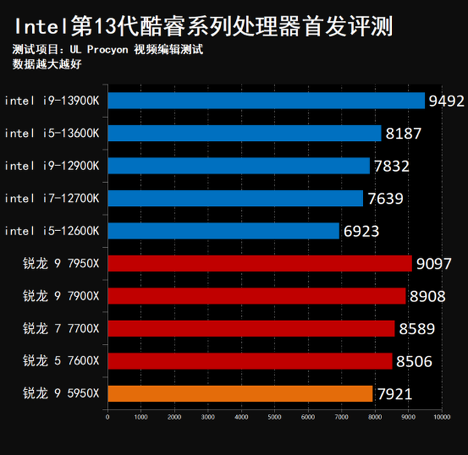 在UL Procyon视频和图像编辑测试项目中,全新的Intel酷睿i9-13900K处理器的性能表现出色,大幅领先上代处理器,并且全面压制了AMD锐龙7000系列处理器,不仅如此,i5-13600K的性能表现同样让人眼前一亮,同样全面领先上代12代酷睿i9,但是仍旧落后锐龙7000系列处理器。