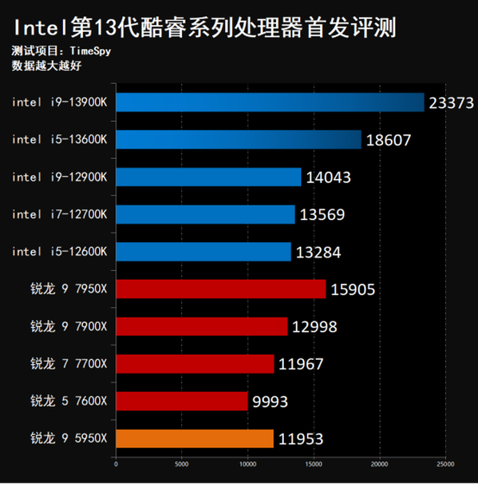 TimeSpy主要测试的是整机对于DX12的游戏性能表现,在TimeSpy测试项目中我们可以看到,Intel酷睿i9-13900K得分为23373,领先上代Intel酷睿i9-12900K约66.4%,领先AMD锐龙 7950X约46.9%;而Intel酷睿i5-13600K在这个项目中得分为18607,同样领先上代i9-12900K约32.5%,并且领先AMD锐龙 7950X约16.9%,性能表现非常优秀。
