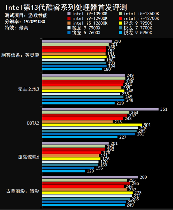 实际的游戏测试方面,我们可以看到Intel酷睿i9-13900K游戏表现非常出色,并且大幅领先上代Intel酷睿i9-12900K,同时intel酷睿i5-13600K的性能同样表现出色,在部分游戏方面同样也领先上代i9-12900K,能够让玩家畅爽各种类型的游戏大作。