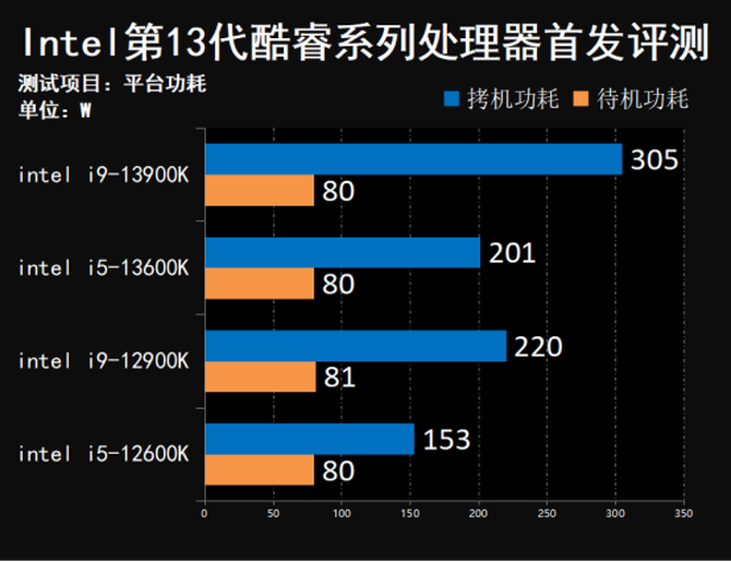 在性能得到大幅度提升之后,13代酷睿的功耗同样也是水涨船高,Intel酷睿i9-13900K单拷CPU整机的功耗能来到305W左右,处理器的功耗大约为225W左右,i5-13600K的满载平台功耗为201W,处理器的功耗约为181W左右,如果搭载旗舰的40系列显卡,个人建议选择850W以上的电源使用,在散热器方面,强烈推荐使用280mm以上的水冷散热器,使用风冷的同学还是不要考虑上i9了。