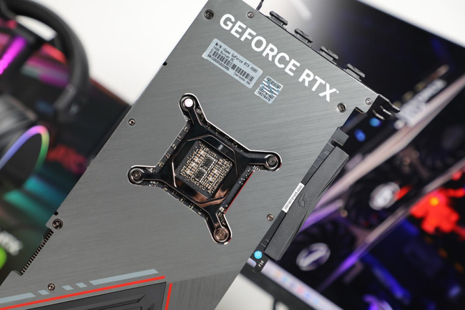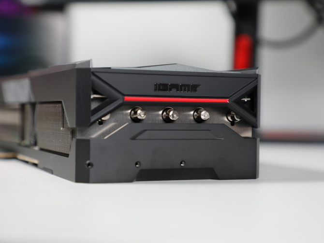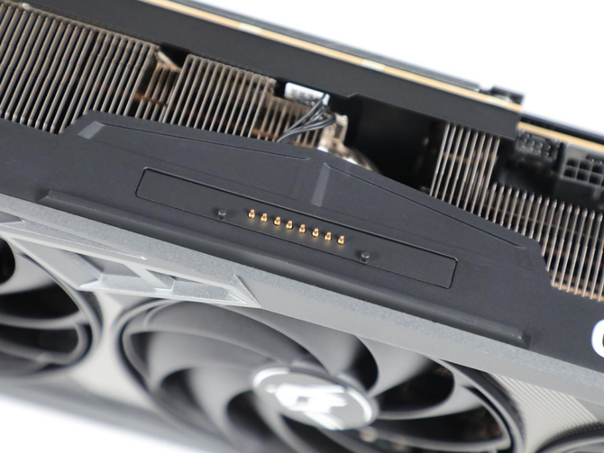 显卡背部我们可以看到,PCB板和iGame RTX 4090火神保持一致,V型的设计,并没有铺满整个散热器,显卡尾部有大面的镂空,这样的好处就是散热效果很好,热交换效率更高,同时这一代的GPU芯片也开始采用了裸露设计。