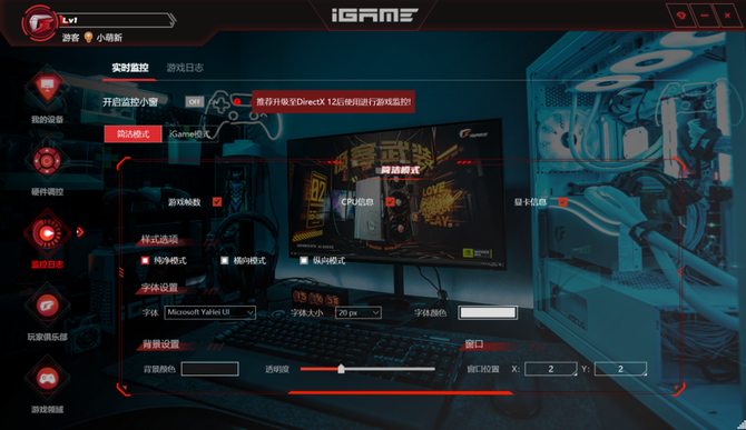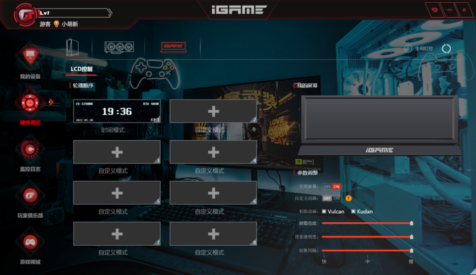 另外搭配全新的iGame Center驱动软件,让用户能够在软件内时刻监控整套平台的运行状态,并且还能够控制灯光效果,让整套平台都能都进行灯光联动,让玩家打造个性化整机RGB灯光效果,同时在软件内我们还能够自定义设置LCD屏幕的内容展示效果,在iGame Center内置了几种动画模式,用户可以选择轮播,或者自己设置动画效果,可玩性非常高,同时还能调整屏幕亮度和轮播速度等操作。