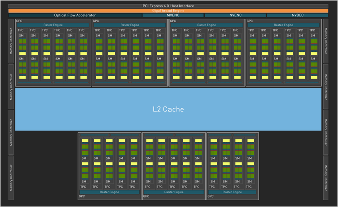 接下来我们看GPC架构图,这一代的GPC每组依然由6组TPC、一个独立光栅引擎和两个ROP分组组成,其中每组TPC里面又包含2组SM单元,这样的架构和上代Ampere保持一致。