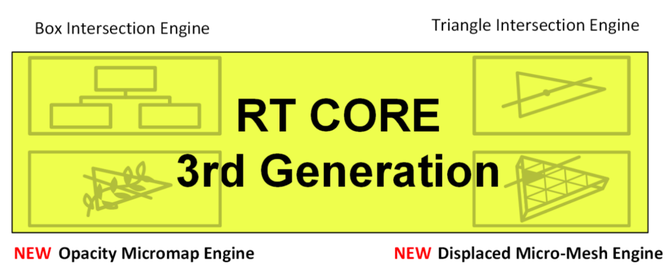全新的第三代RT核心在性能方面相对于上代提升2.8倍,达到191TFLOPS,其内部包括了用于加速边界体积层次(BVH)数据结构遍历的加速单元,去执行射线三角形和光线边界框相交测试计算,这也是目前公认的最!高效的光线追踪计算方式,另外本次还加入了还引入了称为“微映射透明度引擎”(OMM)和“微网格置换引擎”(DMM),可以优化光线追踪渲染效率,使得不规则的图形和半透明的对象都能更快更好地被渲染出来。