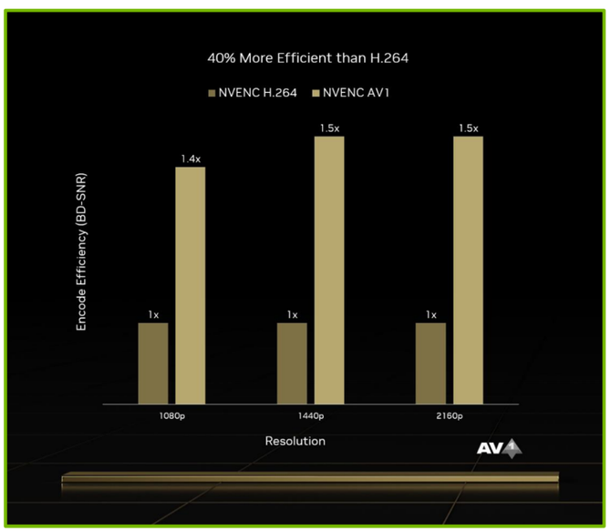 AV1编码作为面向未来的编码方式,能够有效节省网络带宽,相对于传统的编码效率方面提升非常多,对于内容创作和流媒体时代,有着非常大的帮助,全新的RTX 40系列显卡同样支持AV1解码器,对于内容创作者和直播用户来讲,能够大大提升效率。