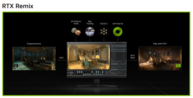 对于游戏开发者和Mod制作者来讲,全新的RTX Remix是NVIDIA专门为这部分用户开发的智能创作应用,通过这款应用能够让数十年前的老游戏也能实现现代化的视觉效果,并且还能够在这些游戏中增加光线追踪功能,让老游戏重换新生,并且配合上NVIDIA Studio驱动和NVIDIA Omniverse的免费MOD平台,还能够创作自己专属的MOD游戏,带给创作者全新的游戏体验。