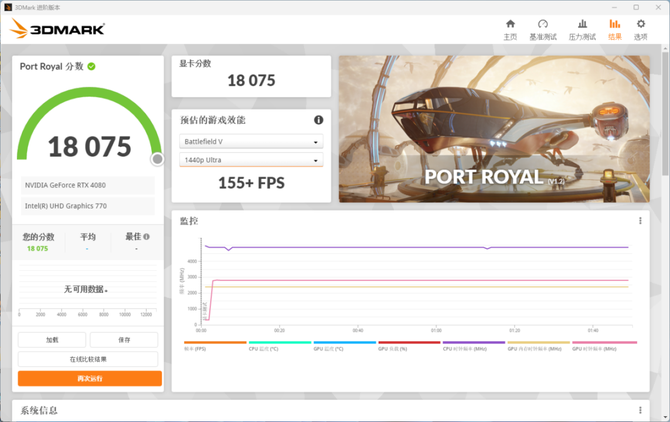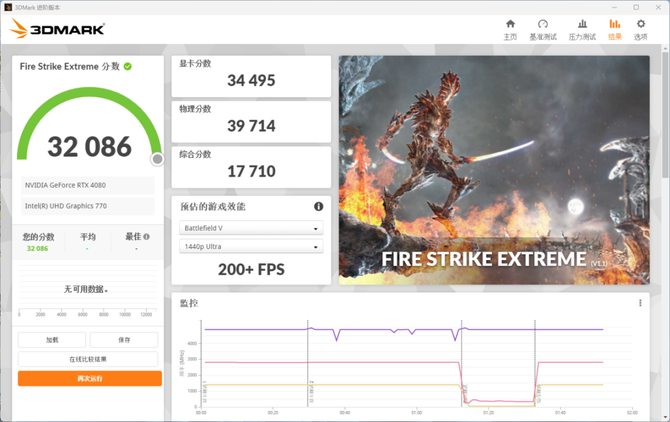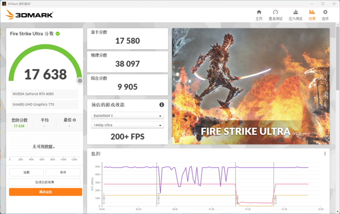 FireStrike作为测试DX11游戏性能的项目,在这个项目中我们可以看到最终的测试结果,在2K分辨率下,战地V这款游戏能够实现200+的游戏帧数,性能表现强悍。