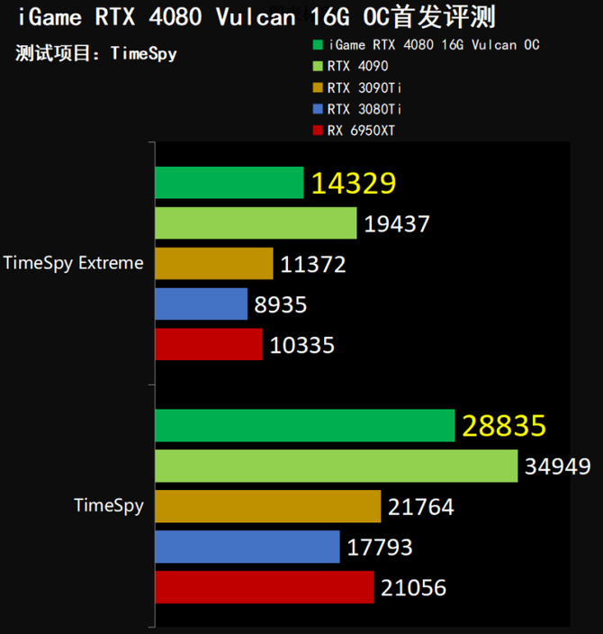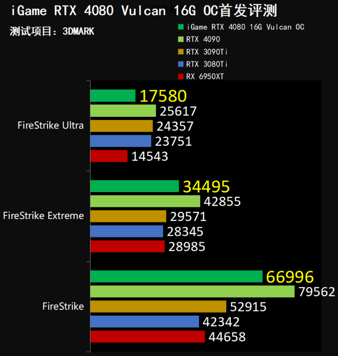 经过我们的实际测试可以看到,在FireStrike测试项目中,iGame GeForce RTX 4080 16GB Vulcan OC领先RTX 3090 Ti约26.6%,领先3080 Ti约58.2%,性能提升非常明显。与此同时,在Firestrike Extreme测试项目中,iGame GeForce RTX 4080 16GB Vulcan OC领先RTX 3090 Ti约16.5%,领先RTX 3080 Ti约21.7%,性能同样表现出色,而在FireStrike Ultra测试项目中,我们可以看到,iGame GeForce RTX 4080 16GB Vulcan OC领先RX 6950XT约20.8%,明显落后于RTX 3080 Ti、RTX 3090 Ti和RTX 4090。