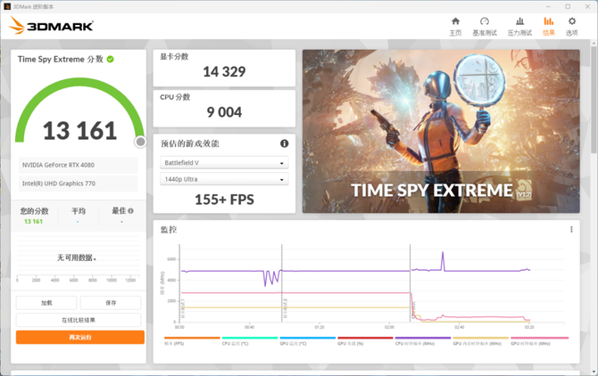 3DMARK作为测试显卡性能的专用软件,并且在新版的3DMARK更新中,已经支持了全新的DLSS 3.0的测试,本次测试我们将iGame GeForce RTX 4080 16GB Vulcan OC开启一键超频,显卡的频率将会提升至2640MHz,并且我们将会选取几款定位接近的显卡进行对比,在这项测试中,我们记录的均为显卡的单独分数,以下为最终测试结果。