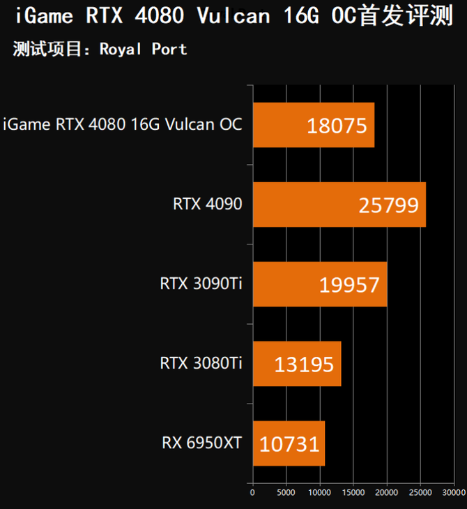 Royal Port光线追踪基准性能测试环节中,我们可以看到,iGame GeForce RTX 4080 16GB Vulcan OC的得分为18075,领先RTX 3080 Ti约36.9%,领先RX 6950XT约68.4%,能够轻松应对市面上绝大部分光追游戏,带给玩家媲美电影级别的光影效果。