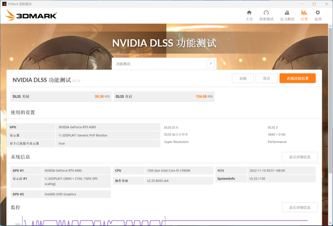 目前,3DMARK已经更新了全新的DLSS 3.0测试,在这项测试中,在4K分辨率下不开启DLSS 3.0的情况下,帧数为39.38fps,在开启DLSS 3.0之后,帧数暴涨到了134.08fps,游戏帧数提升了2.4倍,表现抢眼。