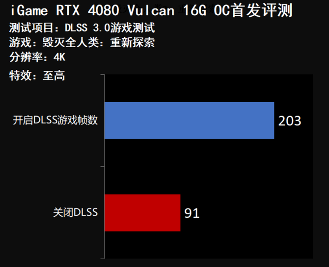 在这款游戏中,经过我们的实际测试,在开启DLSS 3.0之后,游戏的平均帧数从91提升到了203fps,性能提升了2.23倍,提升非常明显。