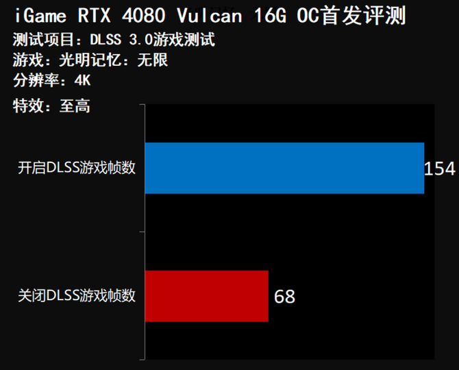 光明记忆:无线是一款国产第!一人称射击类游戏,支持光线追踪和全新的DLSS 3.0技术,测试过程中我们打开光线追踪,分别打开和关闭DLSS,并记录帧数,最终在4K分辨率下,开启DLSS 3.0之后,游戏帧数从68提升到了154,提升了2.26倍,性能提升明显。