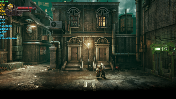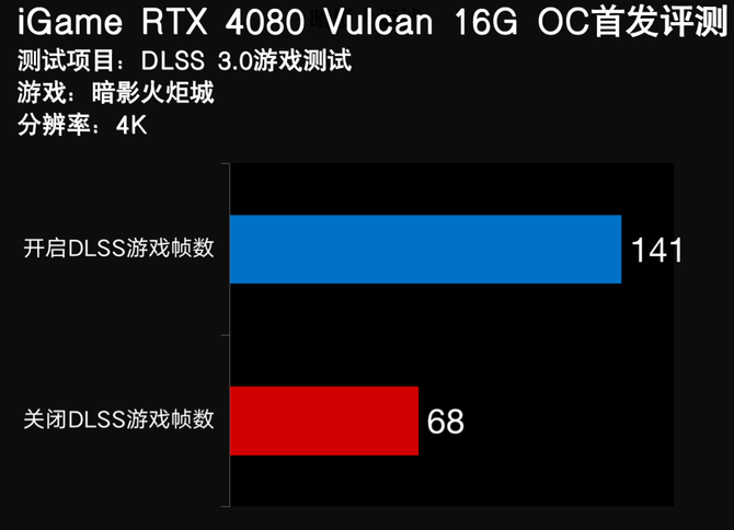 暗影火炬城是一款国产暗黑类的横版格斗闯关游戏,游戏贴图非常精美,画风复古,非常适合那些喜欢横版游戏的玩家,并且这款游戏同样支持全新的DLSS 3.0技术,在4K分辨率下,不开启DLSS 3.0的情况下,游戏帧数为68,在开启DLSS 3.0之后,游戏帧数提升到了141,提升非常明显,达到2倍以上。