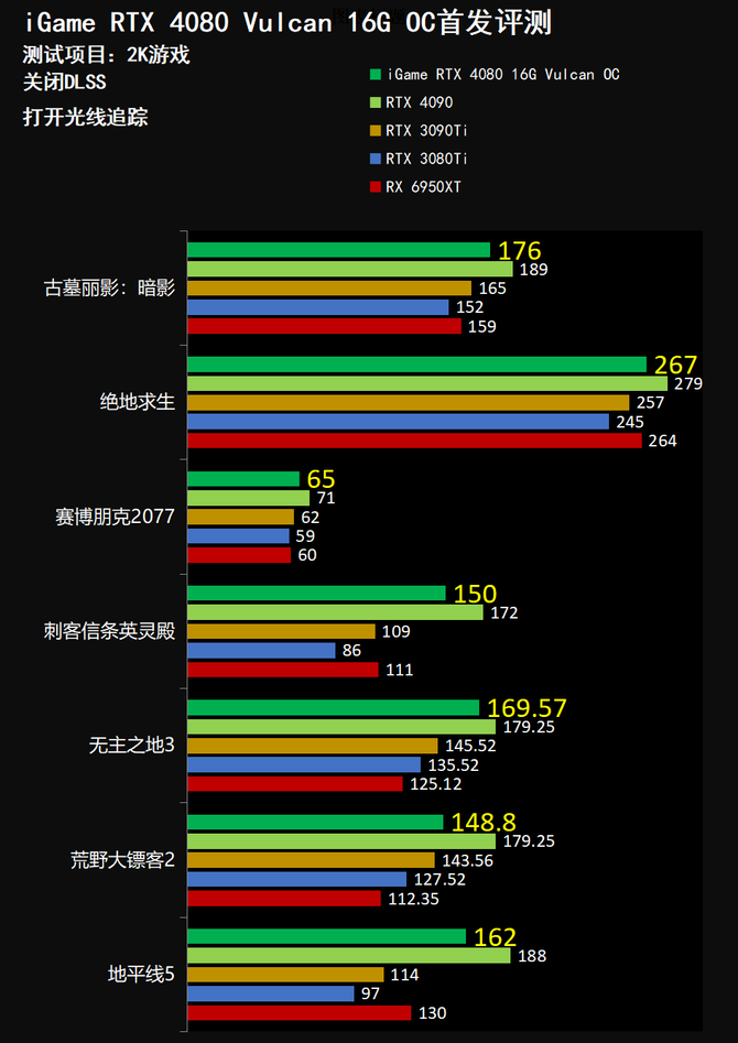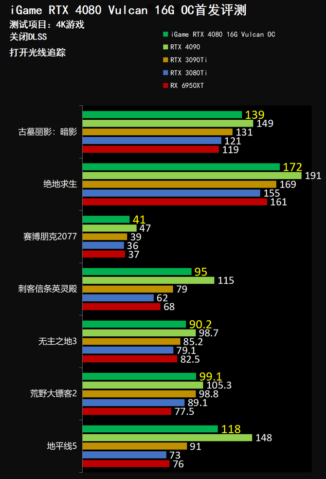 4K游戏方面,在关闭DLSS并且开启光追的时候之后,iGame GeForce RTX 4080 16GB Vulcan OC基本上都能够平趟各种4K游戏大作,并且在绝地求生这款游戏中,FPS能够达到172帧,配合上144Hz的刷新率以及G-Sync技术,能够实现丝滑流畅的游戏体验,将4K游戏带入到一个新的高度。