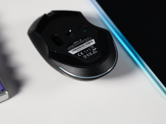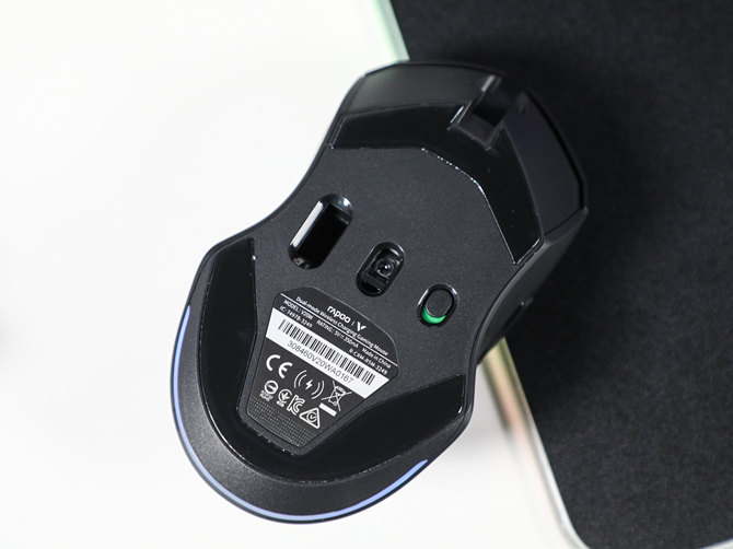 鼠标的底部设计了无线接收器的收纳仓,能够防止出现无线接收器丢失的尴尬境地。并且底部还有鼠标的电源开关,尾部则为无线充电模块。