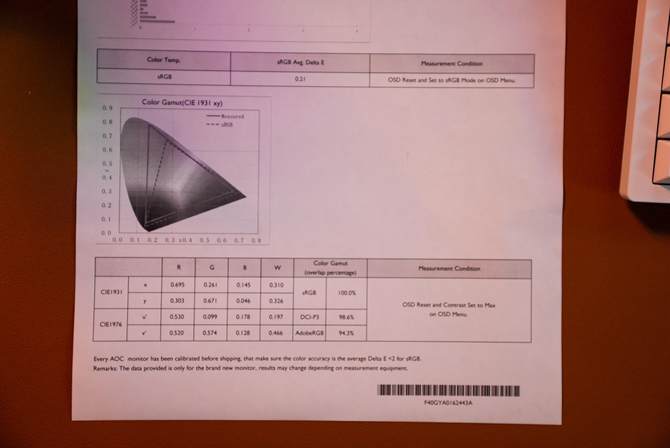 在默认模式下,AG275QXPD 的实测色域达到了100% sRGB + 88% AdobeRGB+ 96% DCI-P3色域覆盖,属于高素质IPS显示器的水平了。sRGB模式模式则覆盖了 97% 的范围,比较中规中矩,还有一定优化空间。这里还是建议大家没有特别需求的话,尽量使用默认模式,比较省心而且观感较佳。