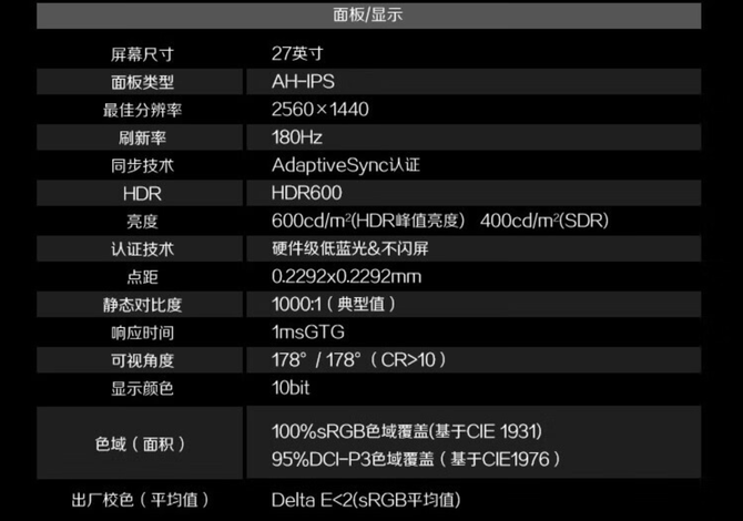 显示规格参数方面,AG275QXPD 是一款标准的“电竞小金刚”显示器,27英寸大小适中,AH-IPS 面板也算是这个价位段的常客,支持 2K 分辨率以及 180Hz 高刷新率。并且通过了VESA协会的 HDR600 认证,最 高支持 600nit 亮度。