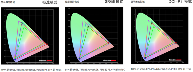 值得一提的是,这块 LG Display 提供的 A+ 级别 AH-IPS 原装面板,在色彩规格方面也堪称豪华,拥有10Bit 色彩(抖动算法),95% P3 色域,100% sRGB 色域,ΔE<2,色彩鲜艳并且还原准确。