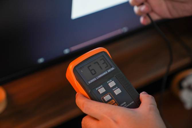 亮度方面,AG275QXPD 的表现同样令人满意。我们分别对 SDR 和 HDR 模式进行了测量。在 SDR 模式下,最大亮度可以达到 381 nit。而 HDR 模式下,最大激发亮度更是直接来到了 673nits,这已经大幅超过了官方宣传的HDR600级别认证,可见这块LGD的原厂面板确实实力非凡。