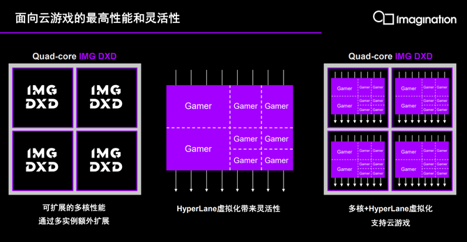 除了支持DirectX 11,IMG DXD在云游戏的每瓦性能上同样亮眼。 IMG DXD的多核组合非常灵活,每个内核都可以作为单独的 GPU 实例独立运行。特别是在云游戏场景中,这有助于最大限度地增加每个 GPU 可承载的游戏玩家数量。或者,利用所有核心组合起来,让单个用户获得高质量的游戏体验。