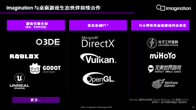 但是想要实现GPU的高效应用,除了GPU本身的软硬件实力出色之外,合作伙伴的支持也相当重要,对此Imagination目前已经和包括O3DE、ROBLOX、GODOT、虚幻等引擎厂商的支持,此外包括网易、米哈游、腾讯旗下光子工作室、完 美世界等国内游戏巨擘有生态上的合作,有着游戏厂商的合作支持,Imagination DXD的生态才能快速发展,目前DXD已经获得了桌面市场的授权许可,预计我们可以在2024年看到基于DXD IP打造的显卡终端产品。