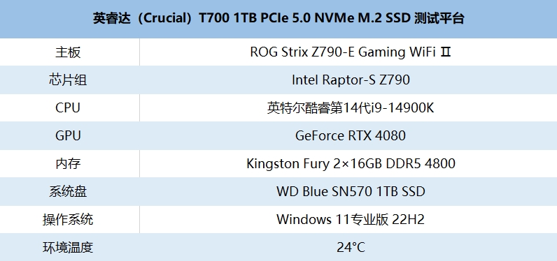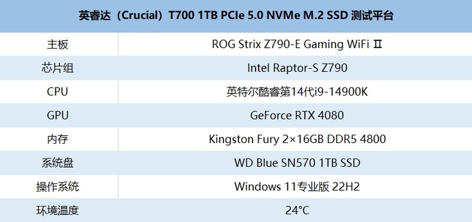 于是就有了此次Crucial英睿达T700 1TB PCIe 5.0 NVMe M.2 SSD 的测试平台,主要配置如下: