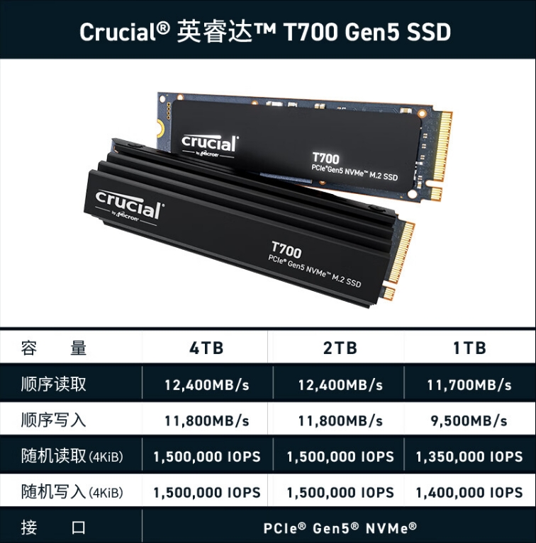 我们此次拿到的为Crucial 英睿达 T700 PCIe 5.0 1TB SSD,来看看其具体的性能表现吧。