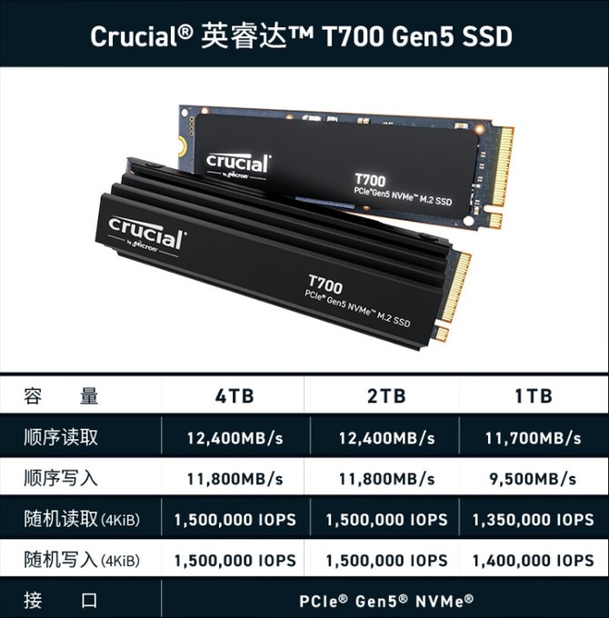 如前所述,全新的Crucial 英睿达 T700 PCIe Gen5 SSD 有1TB、2TB、4TB版本,其中,1TB 版的顺序读取速度为 11700 MB/s,顺序写入为 9500 MB/s。除了有非配备散热器和配备散热器的区别,所有型号均提供5年质保。