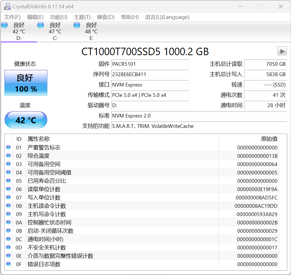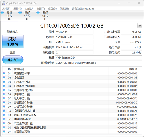 使用CrystalDiskinfo软件可以看到,英睿达T700 的型号为CT1000T700SSD5,容量1TB,接口标准NVMe 2.0,传输模式PCIe 5.0×4。由于英睿达T700自带散热马甲,并且在空间更大的PC主机箱里,基本上不会影响到其散热,更不会影响到其性能的发挥。