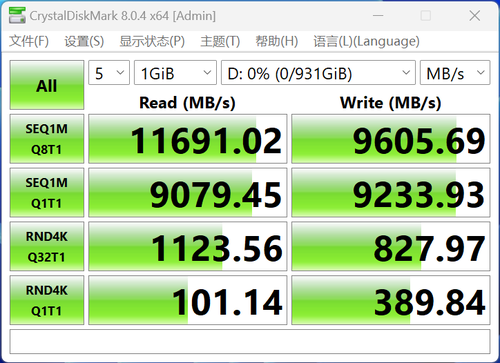 直接上测试结果吧,CrystalDiskMark 的检测结果,顺序读取速度为 11691 MB/s,写入速度 9605.69 MB/s,相比PCIe 4.0 SSD的顺序读取提升了60%,这个成绩来看,肯定是值得升级的。