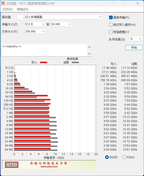 ATTO是通过大小不同的数据块来测试硬盘读写性能的,其柱状图不仅可以显示了在不同数据块的读写速度,还可以查看SSD读写时的稳定性。结果可见,英睿达T700 PCIe 5.0 SSD 在ATTO基准测试中,最大读取速度为 10.72 GB/s,写入速度为 8.96 GB/s,表现不错,而且稳定。
