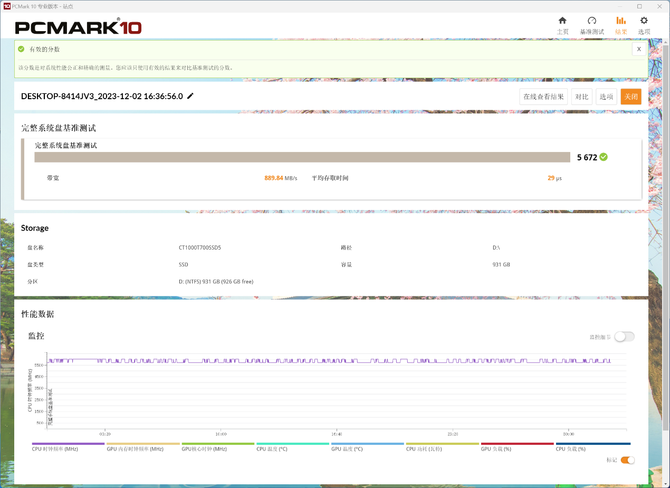 CrystalDiskMark 和 AS SSD Benchmark 测试软件是一种瞬时高负载的压力测试,日常使用中的此类行为并不多,而PCMark 10的存储测试,相对就偏向于常规应用和任务的场景。在完整系统盘基准测试中,Crucial 英睿达 T700 SSD 获得5672的综合得分,带宽 889.84 MB/s,平均存取时间 29 μs。
