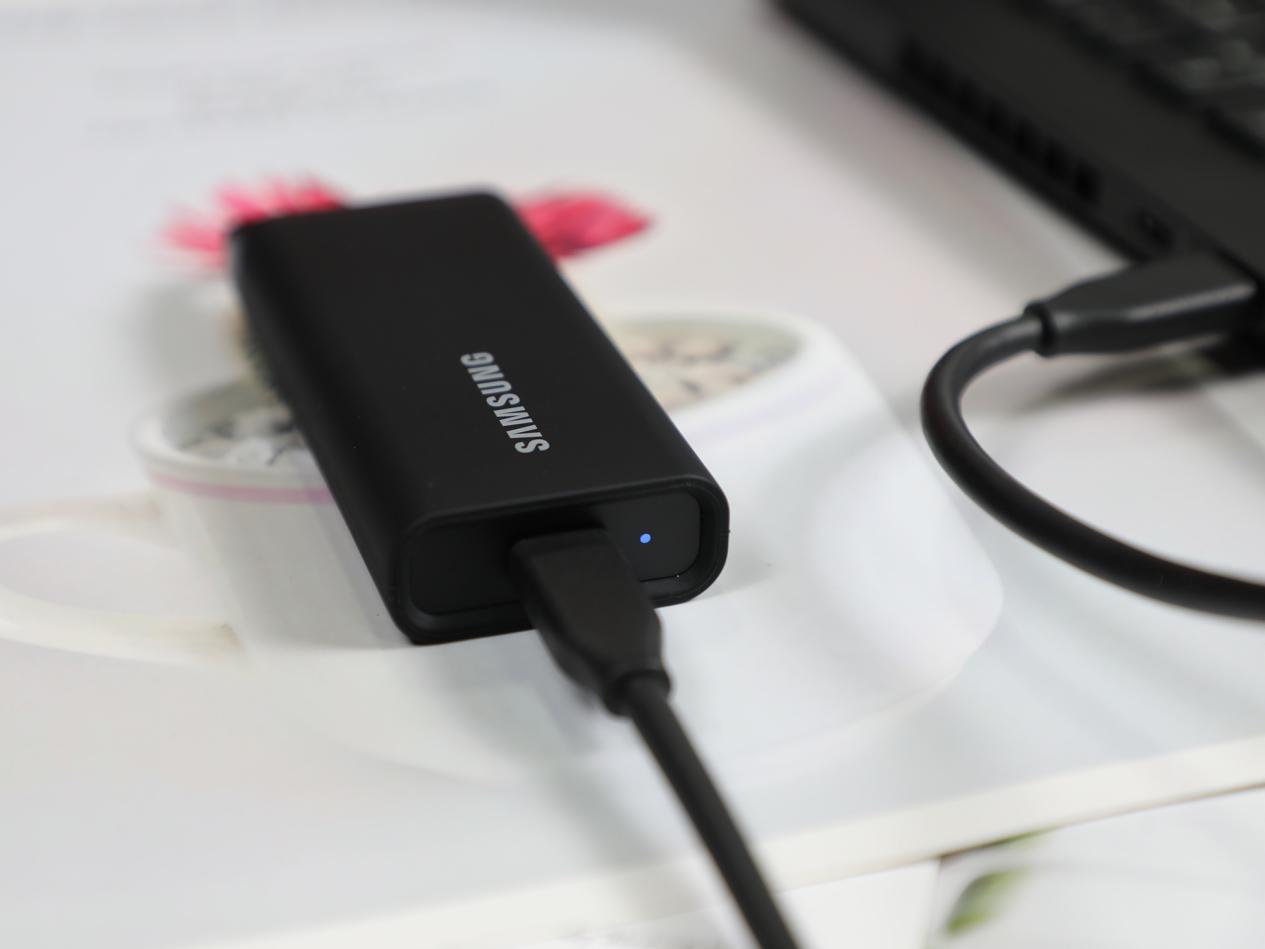 在工作的时候,三星T5 EVO接口旁边的蓝色指示灯会闪烁工作,帮助我们确认硬盘的工作状态,三星T5 EVO采用的接口类型为USB 3.2Gen1 5Gbps的速率,460MB/S的速率基本代表了这个接口的满速,这个速率基本上能够满足绝大部分用户的日常使用要求,存储电影、图片、视频等文件的话,速率完全够。