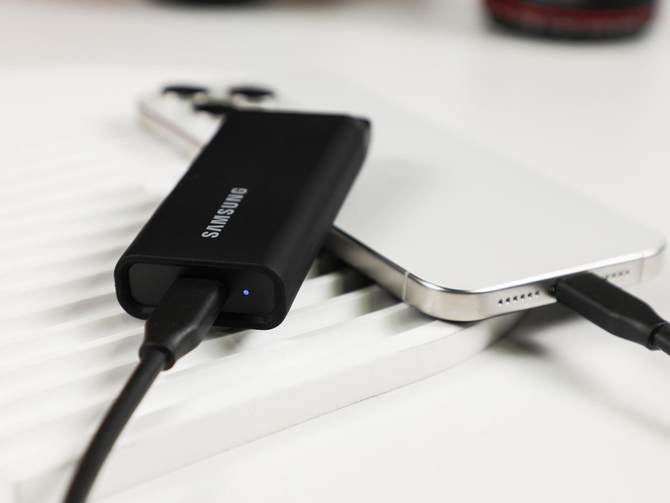 随着全新的iPhone 15 Pro系列手机采用了Type-C接口,三星T5 Evo同样兼容新版本的苹果15 Pro系列,我们外接到iPhone 15 ProMax之后,可以看到指示灯已经凉了,对于很多的Type-C设备来讲,不论是平板、手机还是笔记本电脑,三星T5 Evo均能很好地兼容,满足各种类型设备之间的数据传输,日常使用更为方便。