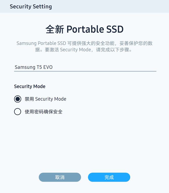 如果你的电脑已经提前安装好了三星魔术师软件,那么一插上三星T5 EVO就会自动识别,并且会提醒用户设置密码,保护我们的数据,AES256位硬件级加密,保证数据不会被盗取,并且如果你的密码太过简单,软件还将会提醒你设置更为复杂的密码。
