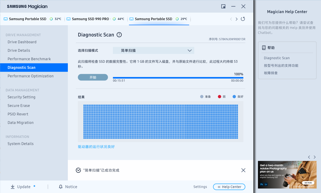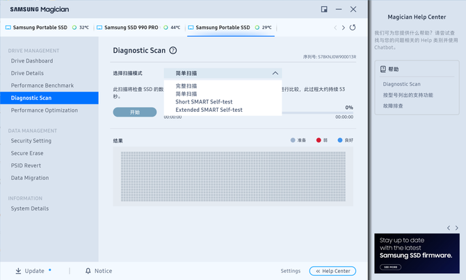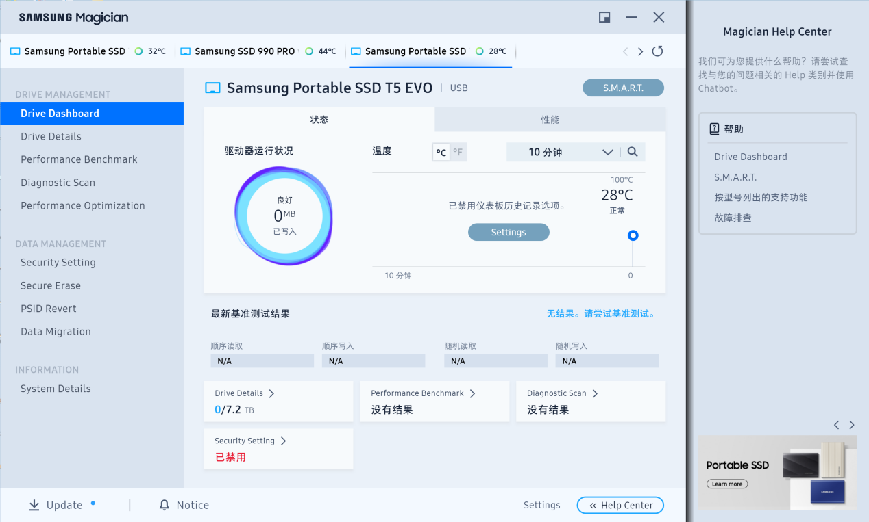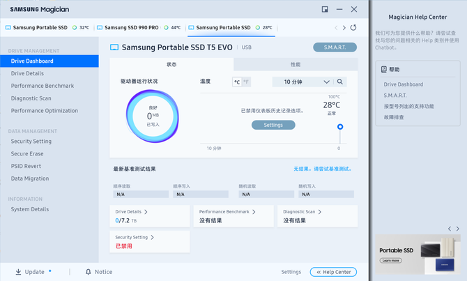 并且在三星魔术师软件内我们还能看到硬盘的实际工作状态,并且还能够对硬盘进行固件升级、性能检测,全盘扫描等操作,让三星T5 EVO的关键信息一目了然地呈现在我们的面前。