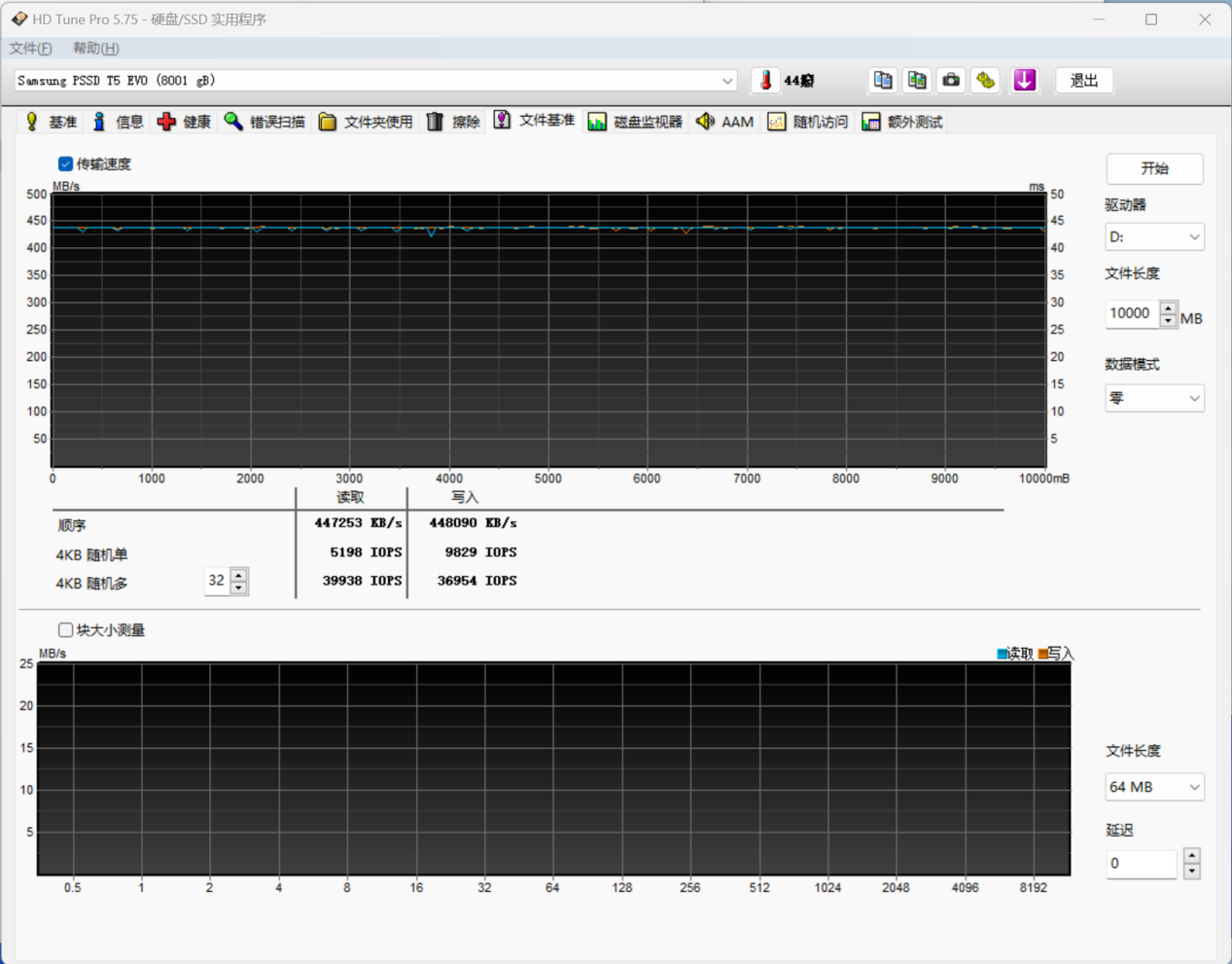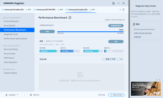 基准性能测试,通过三星魔术师软件内的基准性能测试可以看到,三星T5 EVO的顺序读取速度为438MB/S。