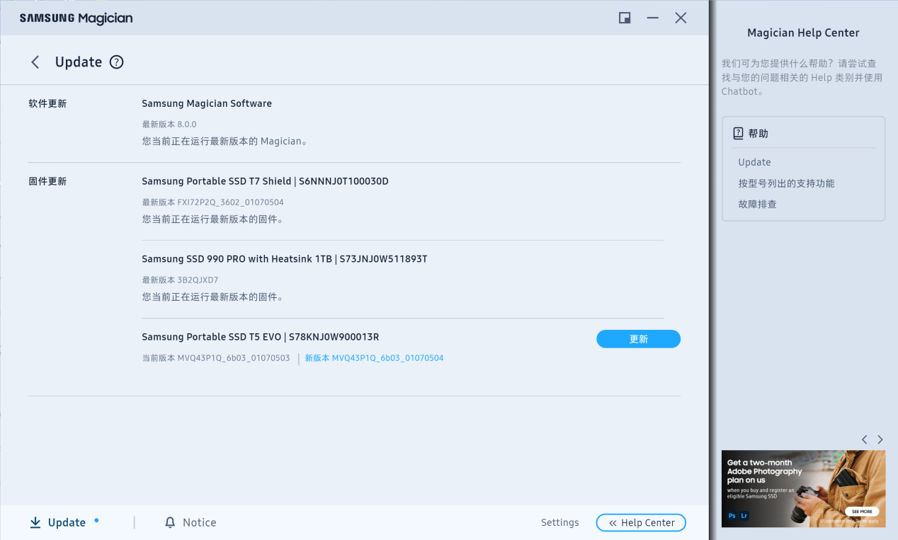 另外,在软件内,我们还能够对固态硬盘的固件进行升级,确保硬盘的性能正常。