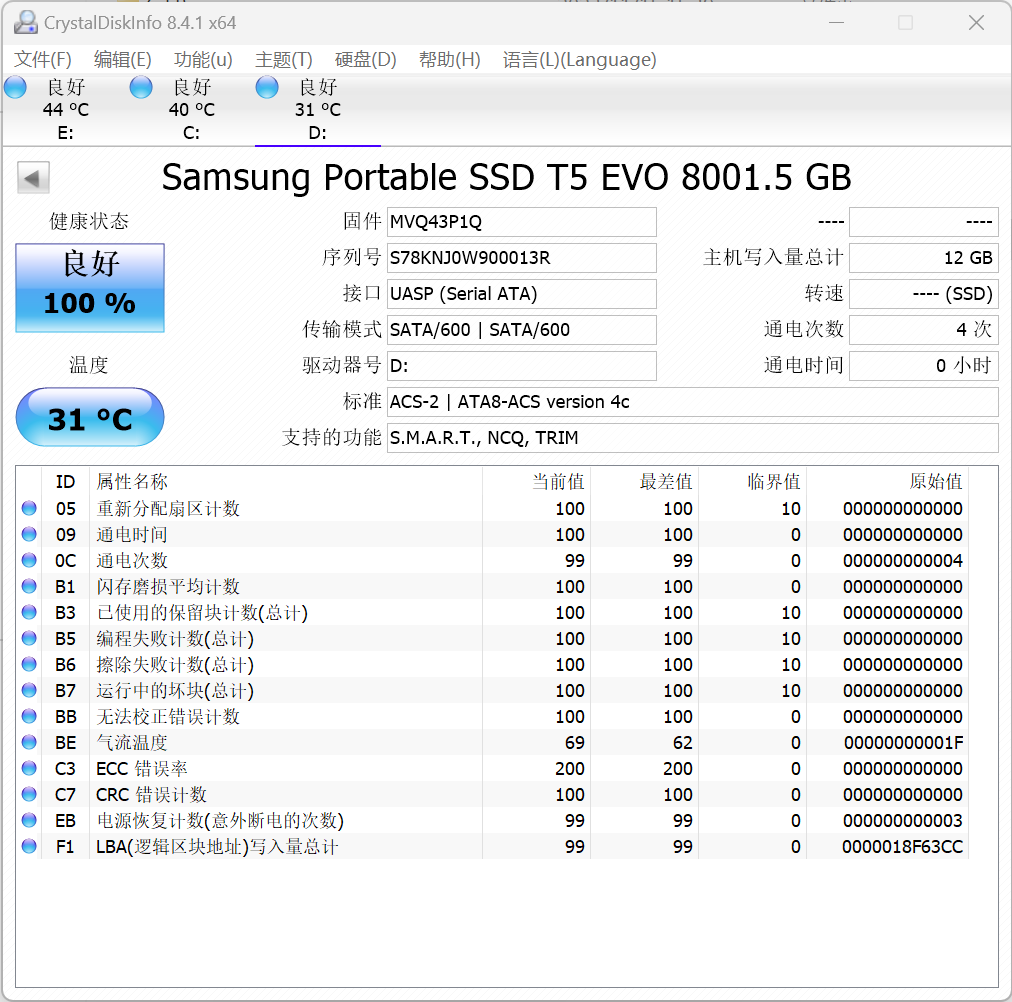 下面我们来进行实际测试测试,通过CrystalDiskinfo信息可以看到,三星T5 EVO的容量为8001.5GB,支持SATA协议。