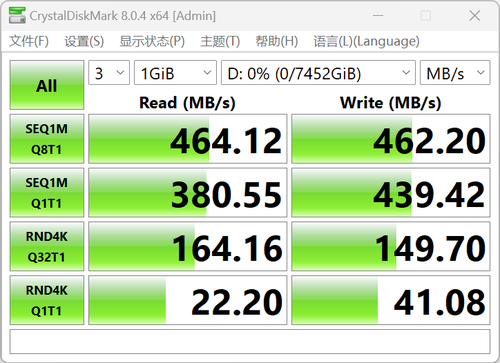 第 一项是我们非常熟悉的CrystalDiskMark 8.0测试,经过实际测试可以看到,三星T5 EVO的顺序读写性能均超过460MB/S,另外,硬盘的随机读取性能达到380MB/S,随机写入则是来到了439MB/S,性能已经属于目前SATA接口硬盘接口的天花板水平。