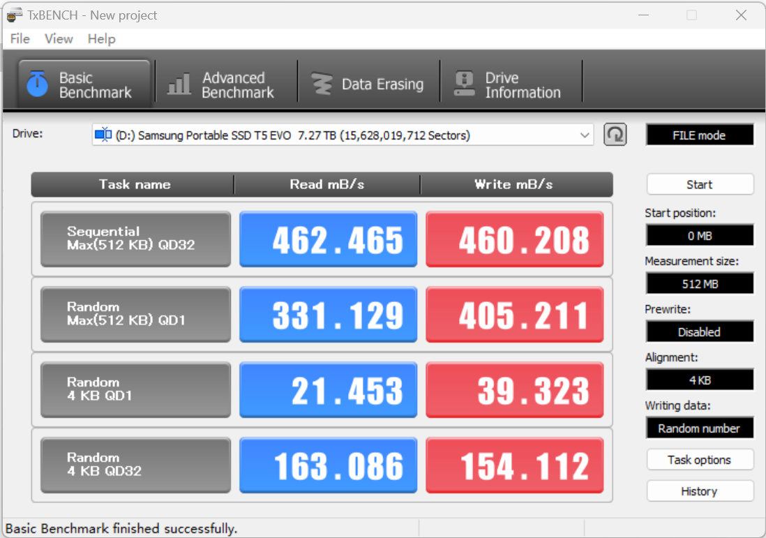 TxBench的顺序读写成绩分别超过460MB/S,比官方宣称的速度还要快,性能出色,同时331MB/S的随机读取和405MB/S的随机写入性能,日常使用也更加出色。
