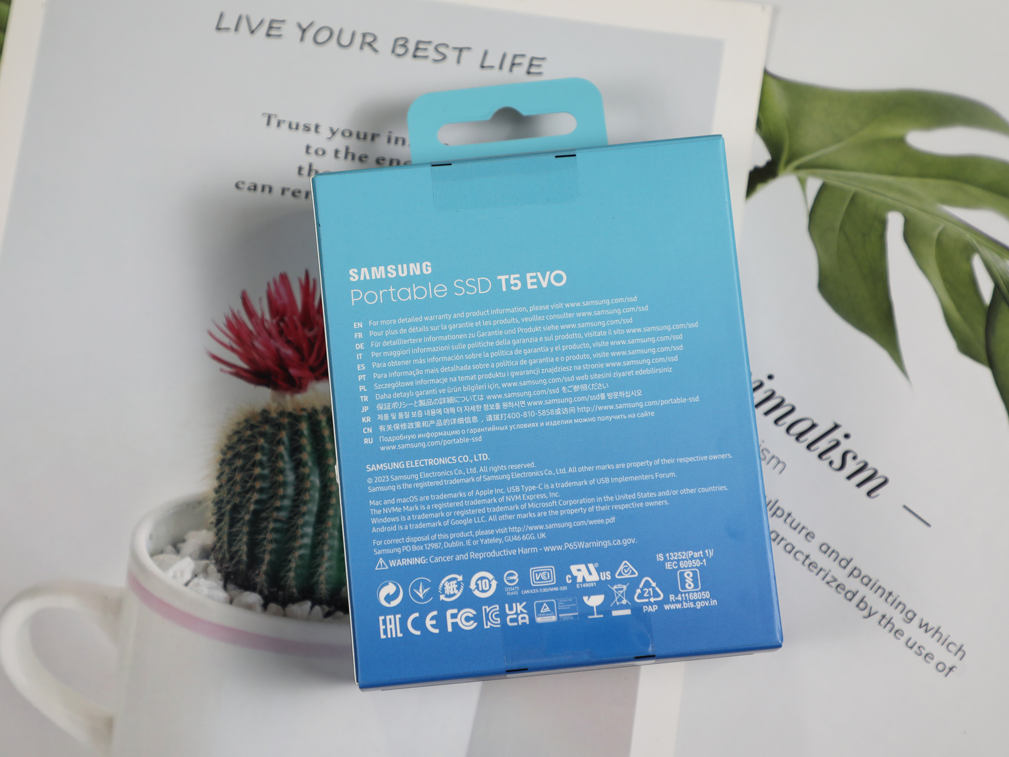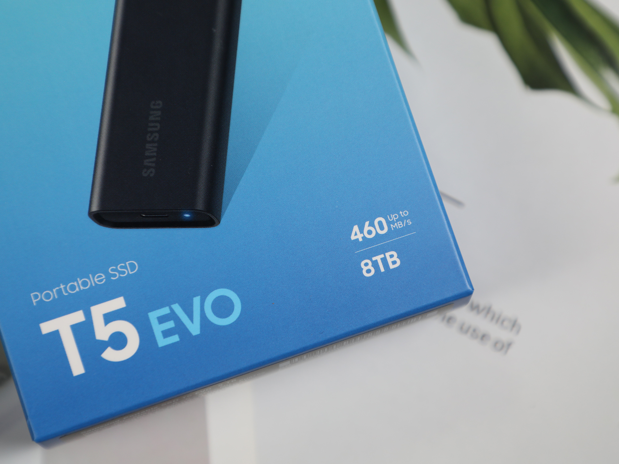 三星T5 EVO的包装采用了蓝色的,渐变过渡的设计,正面是T5 EVO的实物渲染图,整个包装较为简洁,专业风的气息明显。