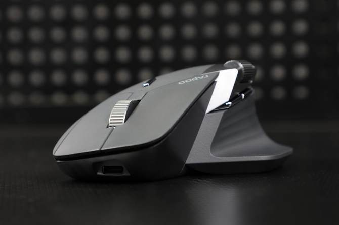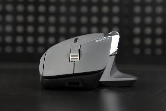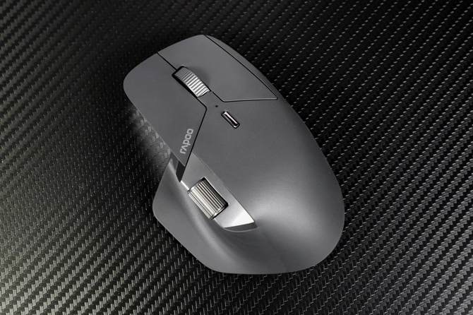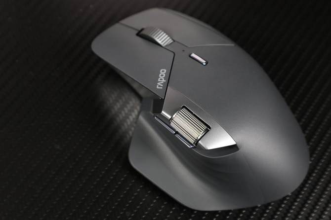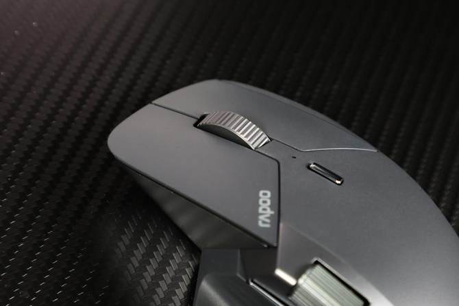 俯看雷柏MT760鼠标,第 一眼就是金属的滚轮和超大的侧裙,侧裙能够很好地支撑拇指,减轻疲劳,而侧部的滚轮采用铝合金霍尔感应设计,通过霍尔磁传感器传递信号,使用的时候滚轮的阻尼感非常好,没有传统滚轮的刻度感,使用更加丝滑,在各种类型的办公中,如OFFICE、PS、剪辑视频时间线拖动上,侧滑轮都能默认支持,带来更好的侧向活动操作的使用体验,体验更好。